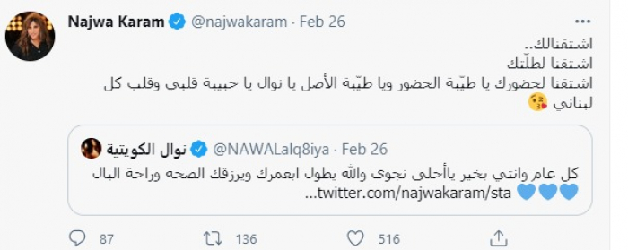 وردت "نجوى" على تهنئة "نوال" لها عبر تويتر، قائلة:"اشتقنالك..اشتقنا لطلّتك..اشتقنا لحضورك يا طيّبة الحضور ويا طيّبة الأصل يا نوال يا حبيبة قلبي وقلب كل لبناني".