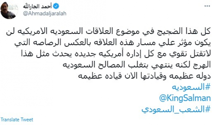 وكتب في تغريدة عبر "تويتر" رصدها "المشهد العربي": "كل هذا الضجيج في موضوع العلاقات السعودية الأمريكية لن يكون مؤثر على مسار هذه العلاقة بالعكس الرصاصة التي لا تقتل تقوى مع كل إدارة أمريكية جديدة يحدث مثل هذا الهرج لكنه ينتهي بتغلب المصالح السعودية".
