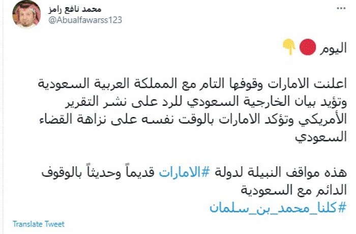 أشاد الكاتب السعودي محمد نافع رامز، اليوم، بمساندة الإمارات للمملكة العربية السعودية بعد الكشف عن تقرير السي آي إيه الخاص بقضية جمال خاشقجي.