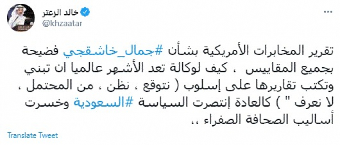 وقال في تغريدة عبر "تويتر" رصدها "المشهد العربي": "تقرير المخابرات الأمريكية بشأن جمال خاشقجي فضيحة بجميع المقاييس، كيف لوكالة تعد الأشهر عالميا أن تبني وتكتب تقاريرها على أسلوب (نتوقع ، نظن ، من المحتمل ، لا نعرف) كالعادة إنتصرت السياسة السعودية وخسرت أساليب الصحافة الصفراء".