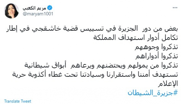 شنت الكاتبة والإعلامية الإماراتية مريم الكعبي، اليوم، هجومًا حادًا على قناة الجزيرة القطرية، وذلك جراء تسييسها لقضية جمال خاشقجي.