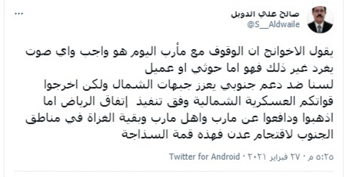 وكتب "الدويل" تغريدة عبر تويتر، رصدها "المشهد العربي": "يقول الإخوانج إن الوقوف مع مأرب اليوم هو واجب وأي صوت يغرد غير ذلك فهو إما حوثي أو عميل".