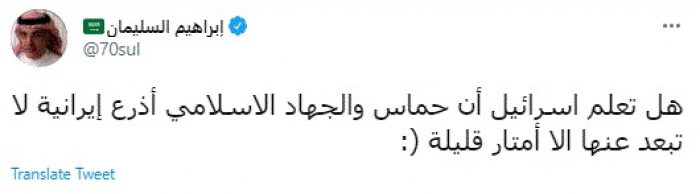 وكتب في تغريدة عبر "تويتر" رصدها "المشهد العربي": "هل تعلم إسرائيل أن حماس والجهاد الإسلامي أذرع إيرانية لا تبعد عنها إلا أمتار قليلة".
