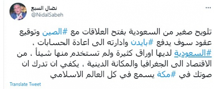 وكتب في تغريدة عبر "تويتر" رصدها "المشهد العربي": "تلويح صغير من السعودية بفتح العلاقات مع الصين وتوقيع عقود سوف يدفع بايدن وإدارته إلى إعادة الحسابات، السعودية لديها أوراق كثيرة ولم تستخدم منها شيئاً، من الاقتصاد إلى الجغرافيا والمكانة الدينية، يكفي أن تدرك أن صوتك في مكة يسمع في كل العالم الإسلامي".
