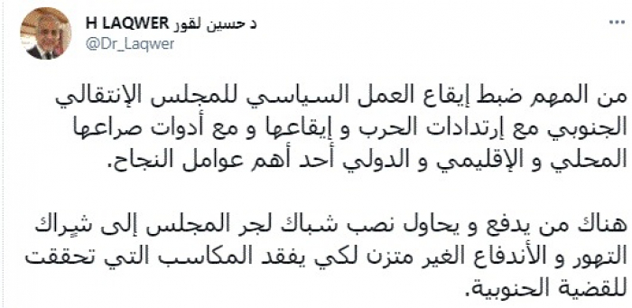 وقال في تغريدة عبر "تويتر" رصدها "المشهد العربي": "من المهم ضبط إيقاع العمل السياسي للمجلس الانتقالي الجنوبي مع ارتدادات الحرب وإيقاعها ومع أدوات صراعها المحلي والإقليمي والدولي أحد أهم عوامل النجاح".