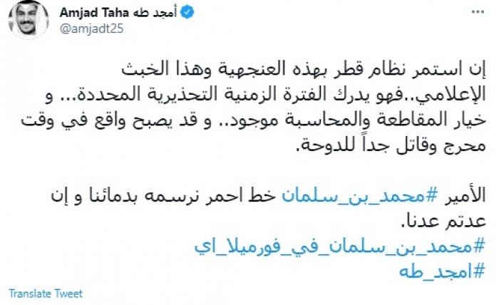 وكتب في تغريدة عبر "تويتر" رصدها "المشهد العربي": "إن استمر نظام قطر بهذه العنجهية وهذا الخبث الإعلامي..فهو يدرك الفترة الزمنية التحذيرية المحددة... وخيار المقاطعة والمحاسبة موجود.. وقد يصبح واقع في وقت محرج وقاتل جداً للدوحة".