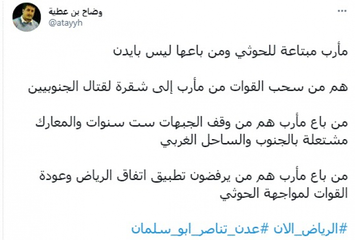 وقال في تغريدة عبر "تويتر" رصدها "المشهد العربي": "مأرب متباعة للحوثي ومن باعها ليس بايدن.. هم من سحب القوات من مأرب إلى شقرة لقتال الجنوبيين".