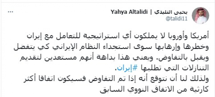 وقال في تغريدة على حسابه بموقع التدوين المصغر تويتر، اليوم إن: "أمريكا وأوروبا لا يملكون أي استراتيجية للتعامل مع إيران وخطرها وإرهابها سوى استجداء النظام الإيراني كي يتفضل ويقبل بالتفاوض".