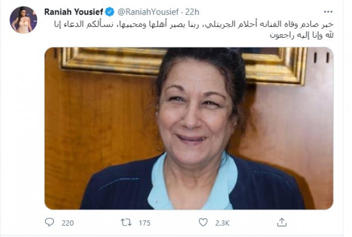 ونشرت رانيا صورة للراحلة عبر حسابها على تويتر، وعلقت: "خبر صادم وفاة الفنانة أحلام الجريتلي.. ربنا يصبر أهلها ومحبيها، نسألكم الدعاء إنا لله وإنا إليه راجعون".