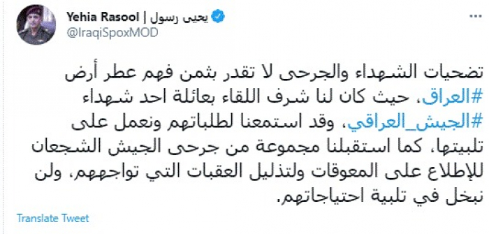 وكتب في تغريدة عبر "تويتر" رصدها "المشهد العربي": "تضحيات الشهداء والجرحى لا تقدر بثمن فهم عطر أرض العراق، حيث كان لنا شرف اللقاء بعائلة أحد شهداء الجيش العراقي، وقد استمعنا لطلباتهم ونعمل على تلبيتها، كما استقبلنا مجموعة من جرحى الجيش الشجعان للإطلاع على المعوقات ولتذليل العقبات التي تواجههم، ولن نبخل في تلبية احتياجاتهم".