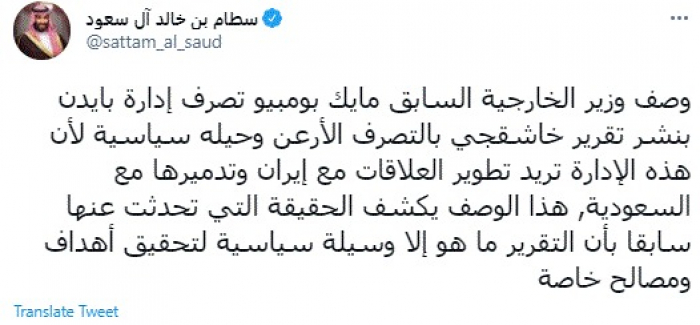 أشاد الأمير السعودي البارز سطام بن خالد آل سعود، اليوم، بتصريحات وزير الخارجية السابق مايك بومبيو بشأن نشر تقرير السي آي إيه لتقرير جمال خاشقجي.