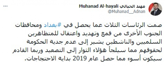 وقال في تغريدة على حسابه بموقع التدوين المصغر تويتر، اليوم إن: صمت الرئاسات الثلاث عما يحصل في بغداد ومحافظات الجنوب الأخرى من قمع وتهديد واعتقال للمتظاهرين السلميين والناشطين يشير إلى عدم جدية الحكومة لحقوقهم".