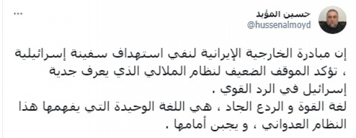 اعتبر الناشط السياسي حسين المؤيد أن نفي إيران مسؤوليتها عن استهداف السفينة الإسرائيلية، دليل على ضعف موقفها.