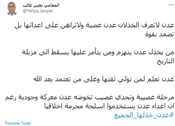 وكتب في تغريدة عبر "تويتر" رصدها "المشهد العربي": "عدن لا تعرف الخذلان عدن عصية ولا تراهن على أعداءها بل تصمد بقوة".