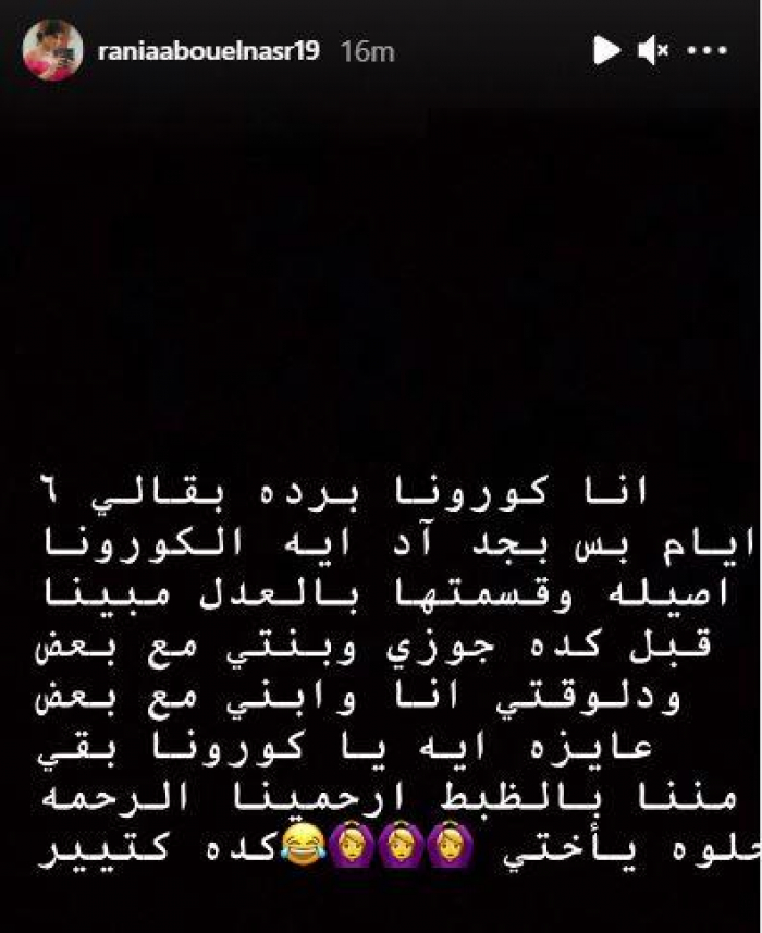 وكتبت رانيا، عبر ستوري حسابها بموقع إنستجرام: "أنا كورونا بردو بقالي 6 أيام، بس بجد قد إيه الكورونا أصيلة وقسمتها بالعدل ما بينا، قبل كدة جوزي وبنتي مع بعض، ودلوقتي أنا وابني مع بعض".