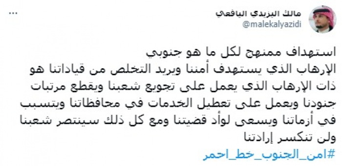 اعتبر الناشط السياسي مالك اليزيدي اليافعي أن هناك استهداف لكل الجنوب بالأعمال الإرهابية، لضرب أمن شعب الجنوب واستقراره، مؤكدا أنها ذات القوى التي تجوع الجنوبيين.