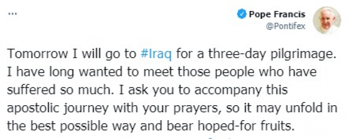 أعلن البابا فرنسيس بابا الفاتيكان، اعتزامه زيارة العراق غدا الجمعة، في زيارة لثلاثة أيام.