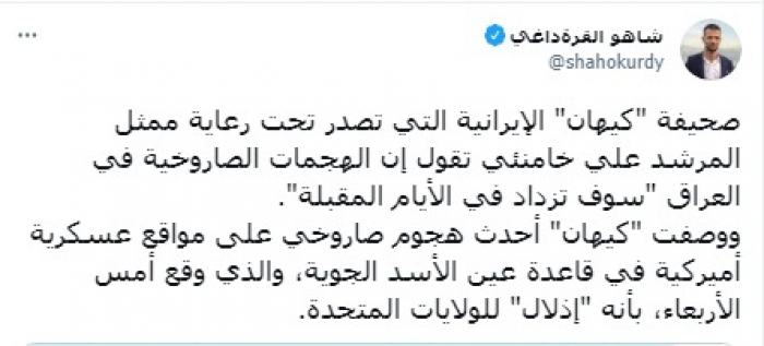 وقال في تغريدة على حسابه بموقع التدوين المصغر تويتر، اليوم إن: "صحيفة "كيهان" الإيرانية التي تصدر تحت رعاية ممثل المرشد علي خامنئي تقول إن الهجمات الصاروخية في العراق (سوف تزداد في الأيام المقبلة).