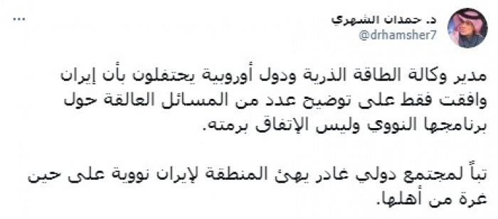 ونبه في تغريدة على حسابه بموقع التدوين المصغر تويتر، اليوم إلى أن: "مدير وكالة الطاقة الذرية ودول أوروبية يحتفلون بأن إيران وافقت فقط على توضيح عدد من المسائل العالقة حول برنامجها النووي وليس الاتفاق برمته".