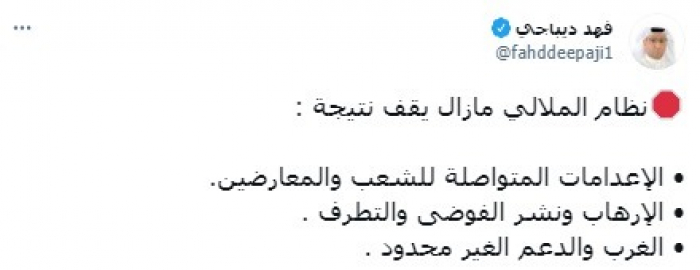 وأوضح في تغريدة على حسابه بموقع التدوين المصغر تويتر، اليوم إن: "نظام الملالي مازال يقف نتيجة الإعدامات المتواصلة للشعب والمعارضين، والإرهاب ونشر الفوضى والتطرف والغرب والدعم الغير محدود".