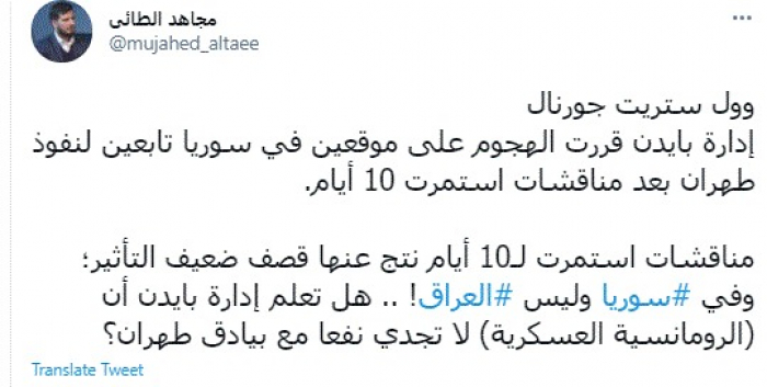 وقال في تغريدة عبر "تويتر" رصدها "المشهد العربي": "وول ستريت جورنال.. إدارة بايدن قررت الهجوم على موقعين في سوريا تابعين لنفوذ طهران بعد مناقشات استمرت 10 أيام.. مناقشات استمرت لـ10 أيام نتج عنها قصف ضعيف التأثير؛ وفي سوريا وليس العراق".
