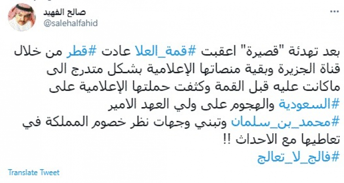 وقال في تغريدة عبر "تويتر" رصدها "المشهد العربي": "بعد تهدئة قصيرة عقبت قمة العلا عادت قطر من خلال قناة الجزيرة وبقية منصاتها الإعلامية بشكل متدرج إلى ما كانت عليه قبل القمة وكثفت حملتها الإعلامية على السعودية والهجوم على ولي العهد الأمير محمد بن سلمان وتبني وجهات نظر خصوم المملكة في تعاطيها مع الأحداث".