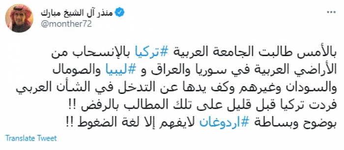 علق المدون السعودي البارز منذر آل الشيخ مبارك، اليوم، على رفض تركيا لطلب الجامعة العربية بالانسحاب من الأراضي العربية.