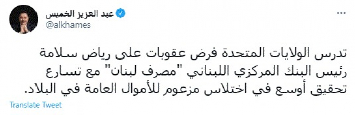 قال الإعلامي السعودي عبدالعزيز الخميس، اليوم، إن الولايات المتحدة الأمريكية تدرس فرض عقوبات على رئيس البنك المركزي اللبناني رياض سلامة.