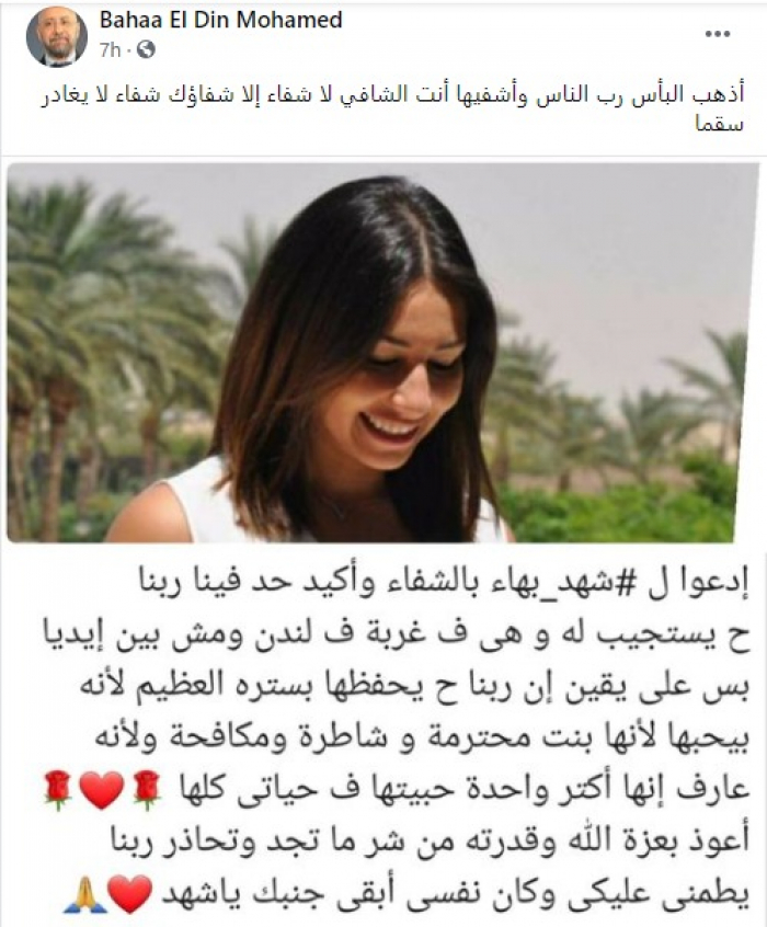 وكتب "بهاء": "ادعوا لشهد بالشفاء وأكيد حد فينا ربنا هيستجيب له وهي في غربة في لندن ومش بإيديا بس على يقين إن ربنا هيحفظها بستره العظيم لإنه بيحبها لانها بنت محترمة وشاطرة ومكافحة".