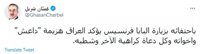 وقال في تغريدة عبر "تويتر" رصدها "المشهد العربي": "باحتفائه بزيارة البابا فرانسيس يؤكد العراق هزيمة داعش وإخواته وكل دعاة كراهية الآخر وشطبه".