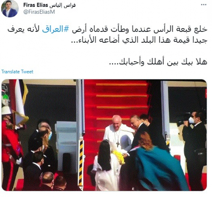 وقال في تغريدة عبر "تويتر" رصدها "المشهد العربي": "خلع قبعة الرأس عندما وطأت قدماه أرض العراق لأنه يعرف جيدا قيمة هذا البلد الذي أضاعه الأبناء".