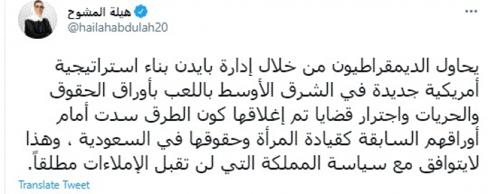 وكتبت في تغريدة عبر "تويتر" رصدها "المشهد العربي": "يحاول الديمقراطيون من خلال إدارة بايدن بناء استراتيجية أمريكية جديدة في الشرق الأوسط باللعب بأوراق الحقوق والحريات واجتزاز قضايا تم إغلاقها كون الطرق سدت أمام أوراقهم السابقة كقيادة المرأة وحقوقها في السعودية، وهذا لا يتوافق مع سياسة المملكة التي لن تقبل الإملاءات مطلقاً".