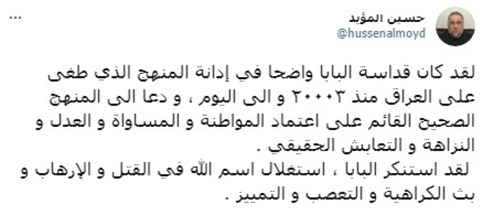 وقال في تغريدة على حسابه بموقع التدوين المصغر تويتر، اليوم: "لقد كان قداسة البابا واضحا في إدانة المنهج الذي طغى على العراق منذ ٢٠٠٣ وإلى اليوم".