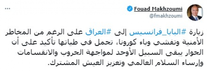 وأكد في تغريدة على حسابه بموقع التدوين المصغر تويتر، اليوم أن: "زيارة البابا فرنسيس إلى العراق على الرغم من المخاطر الأمنية وتفشي وباء كورونا، تحمل في طياتها تأكيد على أن الحوار يبقى السبيل الأوحد لمواجهة الحروب والانقسامات وإرساء السلام العالمي وتعزيز العيش المشترك".