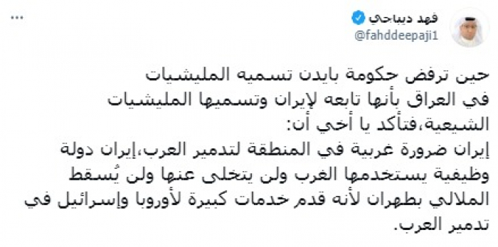 وقال في تغريدة على حسابه بموقع التدوين المصغر تويتر، اليوم إنه: "حين ترفض حكومة بايدن تسميه المليشيات في العراق بأنها تابعه لإيران وتسميها المليشيات الشيعية، فتأكد يا أخي أن: إيران ضرورة غربية في المنطقة لتدمير العرب".