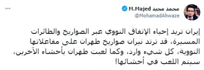 اتهم الكاتب الصحفي محمد مجيد نظام ملالي طهران بالسعي إلى إحياء الاتفاق النووي بالصواريخ والمُسيرات.
