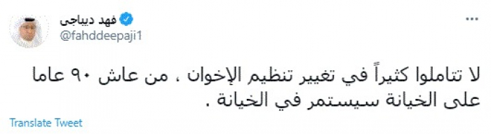 وقال في تغريدة عبر "تويتر" رصدها "المشهد العربي": "لا تتاملوا كثيراً في تغيير تنظيم الإخوان، من عاش ٩٠ عاما على الخيانة سيستمر في الخيانة".
