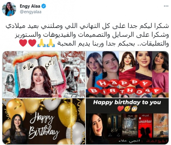 وغردت "إنجي"، عبر "تويتر"، بصور لها وعلقت عليها: "شكرا ليكم جدا على كل التهاني اللي وصلتني بعيد ميلادي، وشكرا على الرسايل والتصميمات والفيديوهات والتعليقات، بحبكم جدا وربنا يديم المحبة".