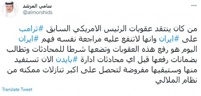 وقال في تغريدة عبر "تويتر" رصدها "المشهد العربي": "من كان ينتقد عقوبات الرئيس الأمريكي السابق ترامب على إيران وإنها لا تنفع عليه مراجعة نفسه فهم إيران اليوم هو رفع هذه العقوبات وتضعها شرطا للمحادثات وتطالب بضمانات رفعها قبل أي محادثات إدارة بايدن الآن تستفيد منها وستبقيها مفروضة لتحصل على اكبر تنازلات ممكنه من نظام الملالي".