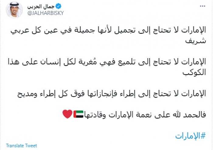 وكتب في تغريدة عبر "تويتر" رصدها "المشهد العربي": "الإمارات لا تحتاج إلى تجميل لأنها جميلة في عين كل عربي شريف.. الإمارات لا تحتاج إلى تلميع فهي مُغرية لكل إنسان على هذا الكوكب.. الإمارات لا تحتاج إلى إطراء فإنجازاتها فوق كل إطراء ومديح.. فالحمد لله على نعمة الإمارات وقادتها".