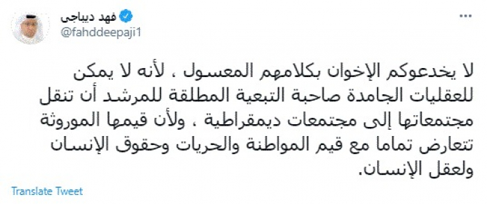 وكتب في تغريدة عبر "تويتر" رصدها "المشهد العربي": "لا يخدعوكم الإخوان بكلامهم المعسول، لأنه لا يمكن للعقليات الجامدة صاحبة التبعية المطلقة للمرشد أن تنقل مجتمعاتها إلى مجتمعات ديمقراطية، ولأن قيمها الموروثة تتعارض تماما مع قيم المواطنة والحريات وحقوق الإنسان ولعقل الإنسان".