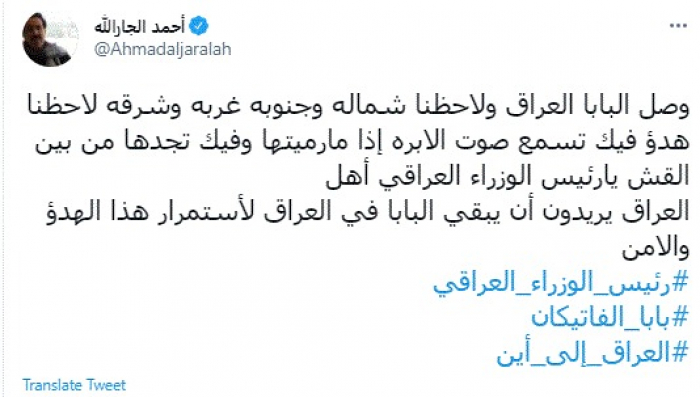 وقال في تغريدة عبر "تويتر" رصدها "المشهد العربي": "وصل البابا العراق ولاحظنا شماله وجنوبه غربه وشرقه لاحظنا هدء فيك تسمع صوت الإبره إذا ما رميتها وفيك تجدها من بين القش".