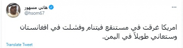 وكتب في تغريدة عبر "تويتر" رصدها "المشهد العربي": "أمريكا غرقت في مستنقع فيتنام وفشلت في افغانستان وستعاني طويلًا في اليمن".