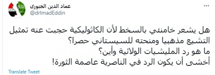 وقال في تغريدة عبر "تويتر" رصدها "المشهد العربي": "هل يشعر خامنئي بالسخط لأن الكاثوليكية حجبت عنه تمثيل التشيع مذهبيا ومنحته للسيستاني حصرا؟ ما هو رد المليشيات الولائية وأين؟ أخشى أن يكون الرد في الناصرية عاصمة الثورة".