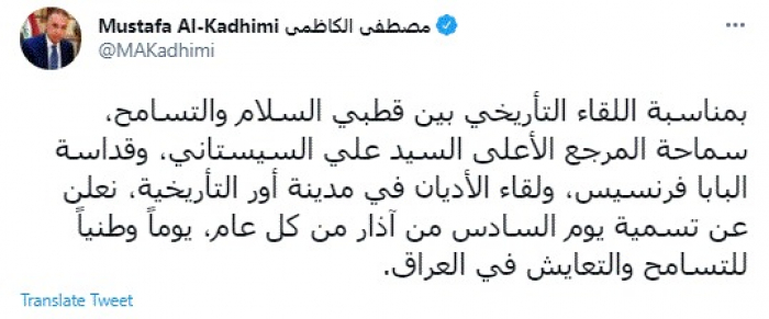وقال في تغريدة عبر "تويتر" رصدها "المشهد العربي": "بمناسبة اللقاء التأريخي بين قطبي السلام والتسامح، سماحة المرجع الأعلى السيد علي السيستاني، وقداسة البابا فرنسيس، ولقاء الأديان في مدينة أور التأريخية، نعلن عن تسمية يوم السادس من آذار من كل عام، يوماً وطنياً للتسامح والتعايش في العراق".