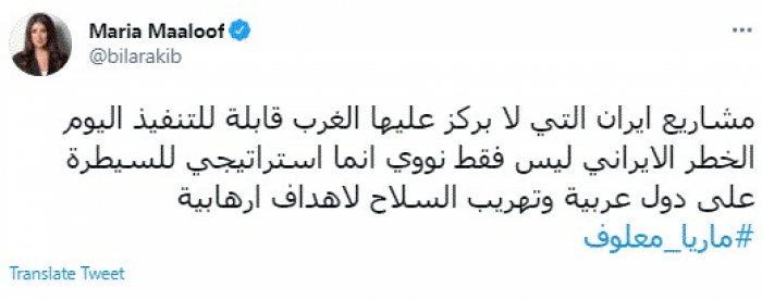 حذرت الإعلامية اللبنانية ماريا معلوف، اليوم، من خطر المشاريع الإيرانية الخاصة بالهيمنة على الدول العربية وتهريب السلاح لأهداف إرهابية.
