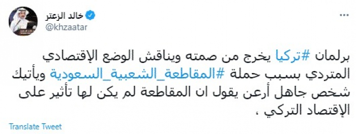 وكتب في تغريدة عبر "تويتر" رصدها "المشهد العربي": "برلمان تركيا يخرج من صمته ويناقش الوضع الإقتصادي المتردي بسبب حملة المقاطعة الشعبية السعودية ويأتيك شخص جاهل أرعن يقول ان المقاطعة لم يكن لها تأثير على الإقتصاد التركي".