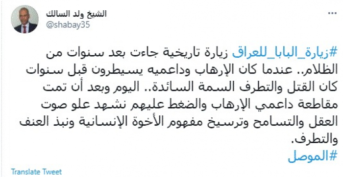وكتب في تغريدة عبر "تويتر" رصدها "المشهد العربي": "زيارة البابا للعراق زيارة تاريخية جاءت بعد سنوات من الظلام.. عندما كان الإرهاب وداعميه يسيطرون قبل سنوات كان القتل والتطرف السمة السائدة.. اليوم وبعد أن تمت مقاطعة داعمي الإرهاب والضغط عليهم نشهد علو صوت العقل والتسامح وترسيخ مفهوم الأخوة الإنسانية ونبذ العنف والتطرف".