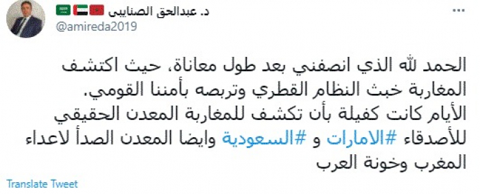 وكتب في تغريدة عبر "تويتر" رصدها "المشهد العربي": "الحمد لله الذي أنصفني بعد طول معاناة، حيث اكتشف المغاربة خبث النظام القطري وتربصه بأمننا القومي. الأيام كانت كفيلة بأن تكشف للمغاربة المعدن الحقيقي للأصدقاء الإمارات والسعودية وأيضًا المعدن الصدأ لأعداء المغرب وخونة العرب".