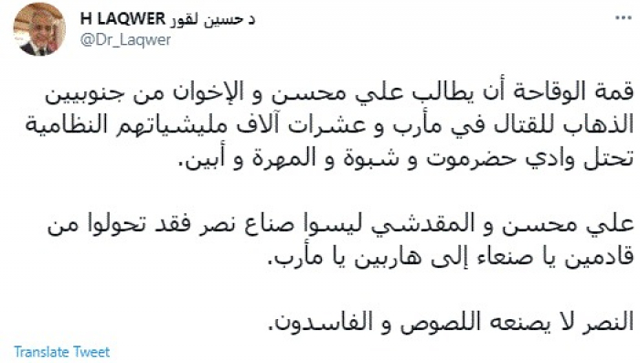 وقال في تغريدة عبر "تويتر" رصدها "المشهد العربي": "قمة الوقاحة أن يطالب علي محسن والإخوان من جنوبيين الذهاب للقتال في مأرب وعشرات آلاف مليشياتهم النظامية تحتل وادي حضرموت وشبوة والمهرة وأبين".